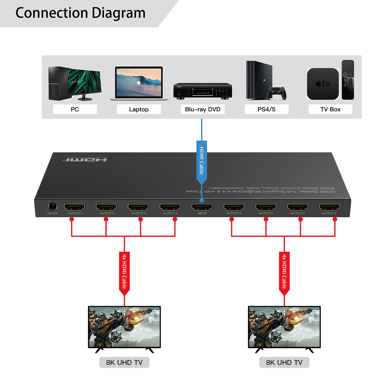When turn to the downscaler function, it can downscale the input 8K resolution to 4K or 1080p by the UHD (4K) or FHD (1080p) Display and 8K Resolution to the 8K Displays Simultaneously. - Support full 3D video format.
