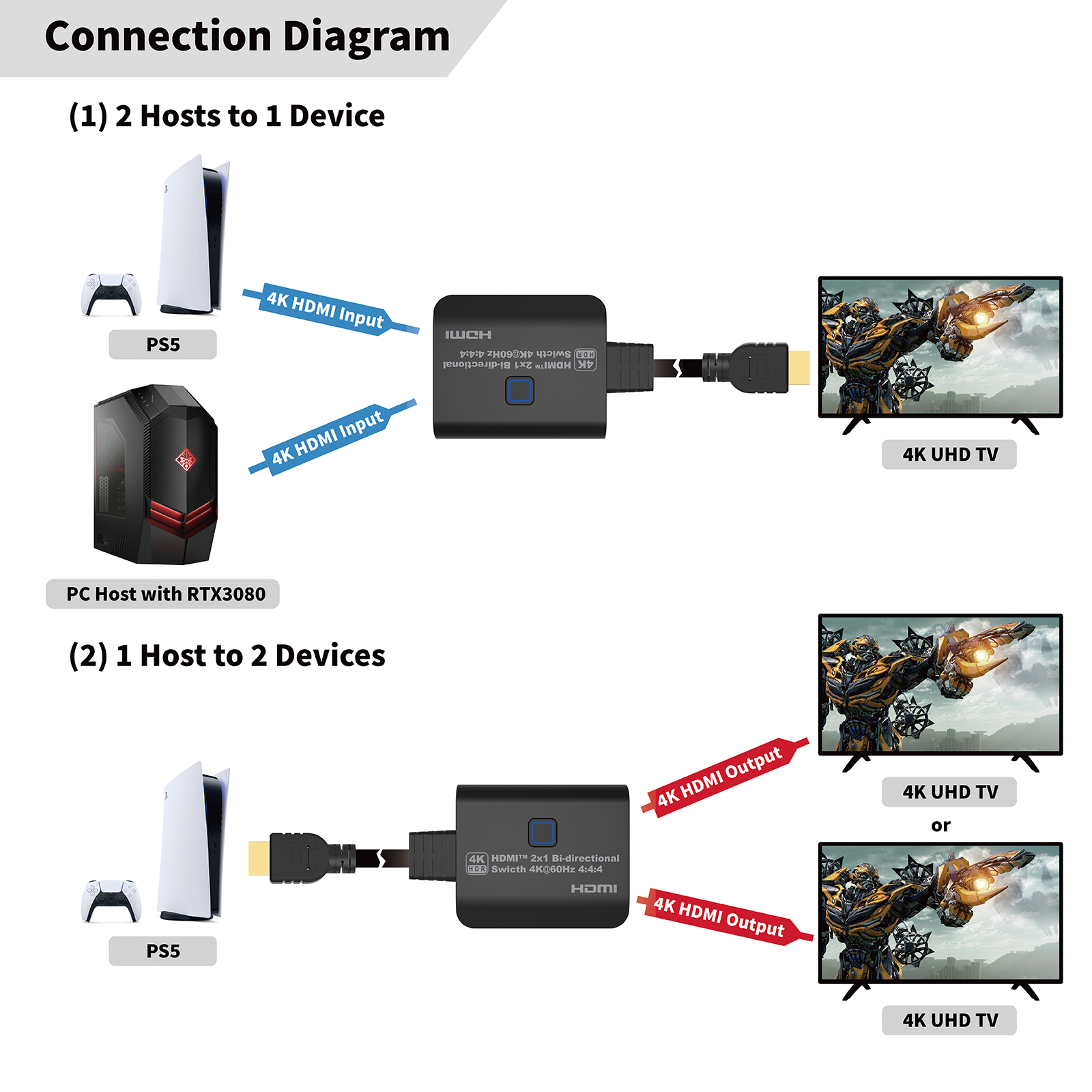• 2 HDMI-Host to 1 HDMI monitor.