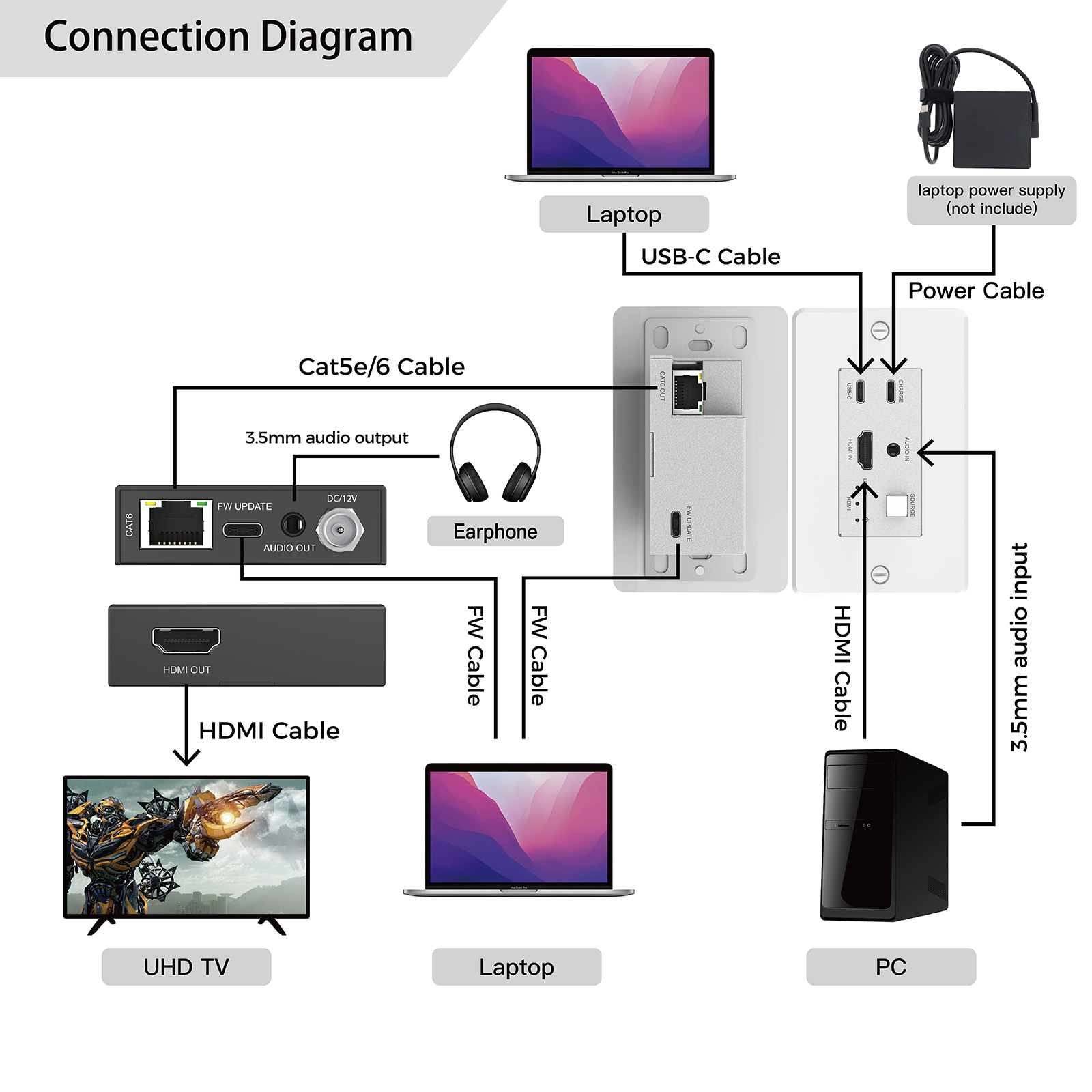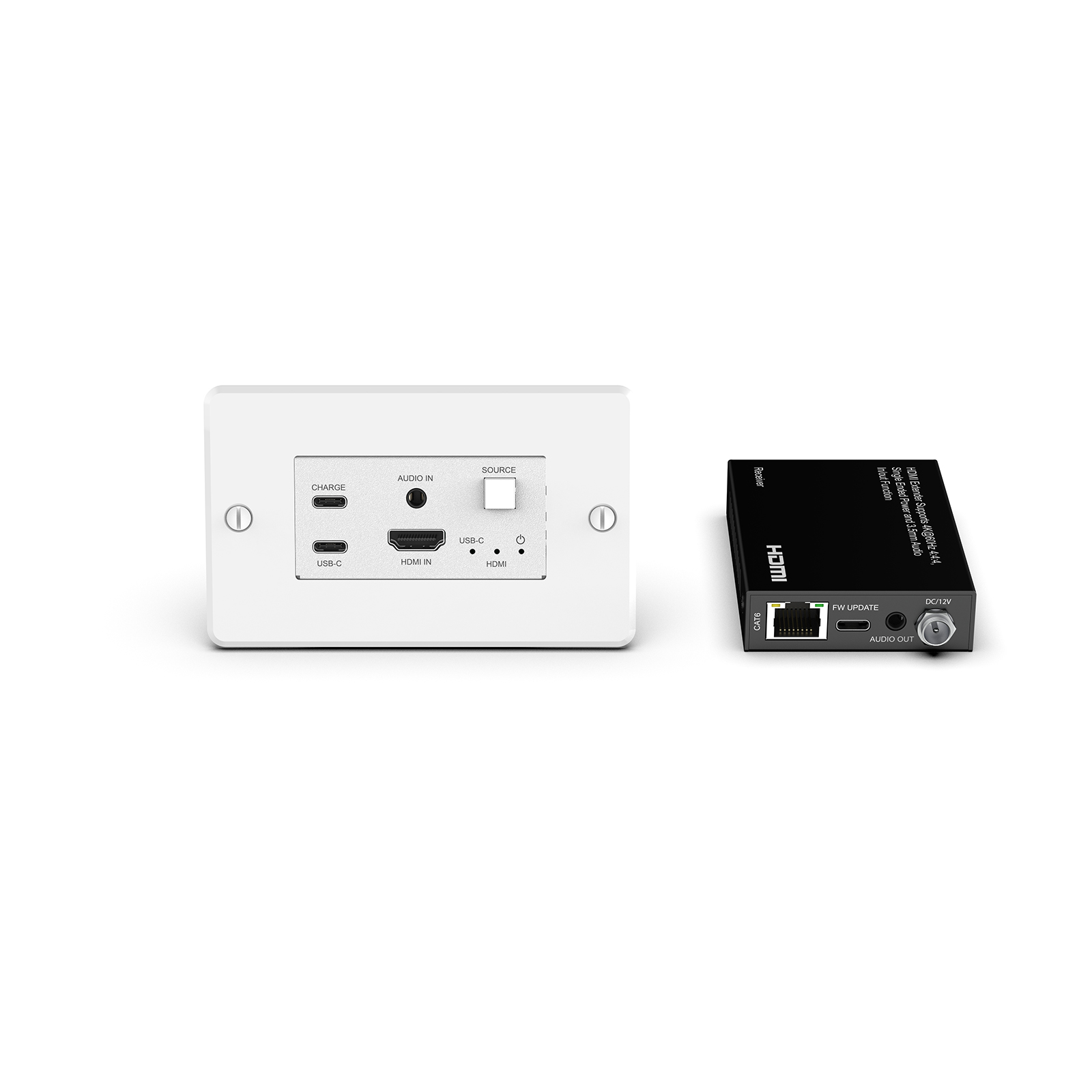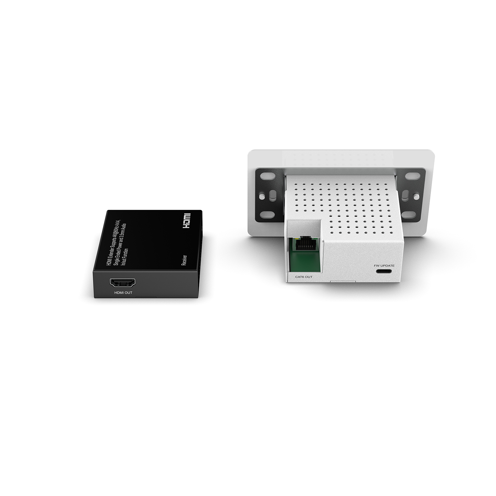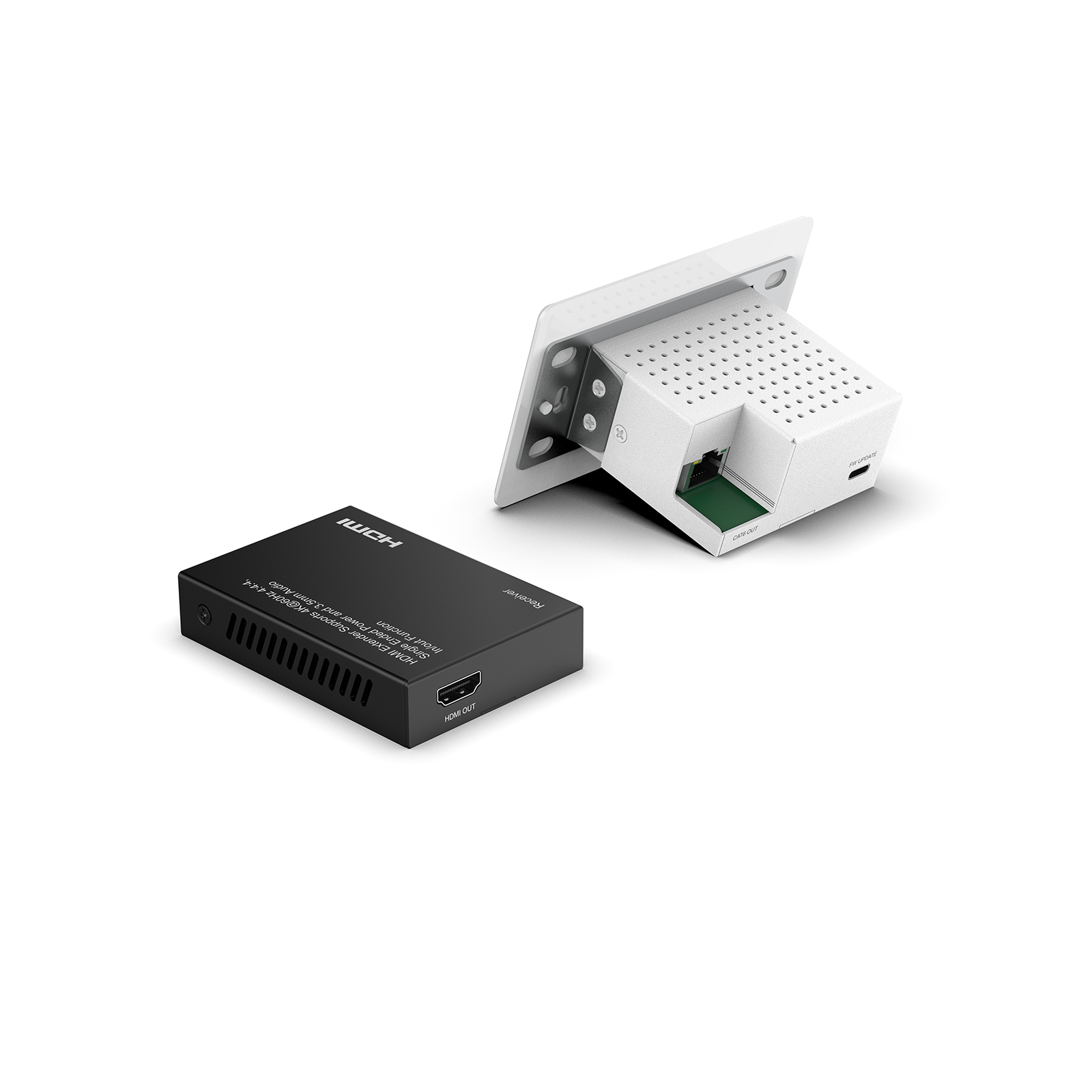 The HDMI™ extender is an ideal device for remote viewing. It extend the input of the HDMI™ or USB-C (DP Alt Mode) signal to remote outputs up to 4K@60Hz at 35m (115feet)/1080p@60Hz at 50m (164feet) , perfect for point-to-point digital signage applications that require high quality HDMI™ video up to 4K@60Hz 4:4:4. It also Supports Audio Eembedded and De-Eembedded Function, ideal for education or confrence. It features single ended power supply enabling the transmitter to be powered by a single 12V power supply from the receiver.