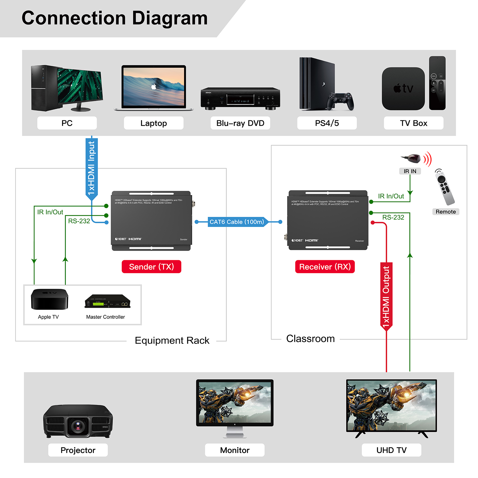 • Support HDBaseT 1.0 over a single CAT5e/6/7 cable up to 100m/330ft.