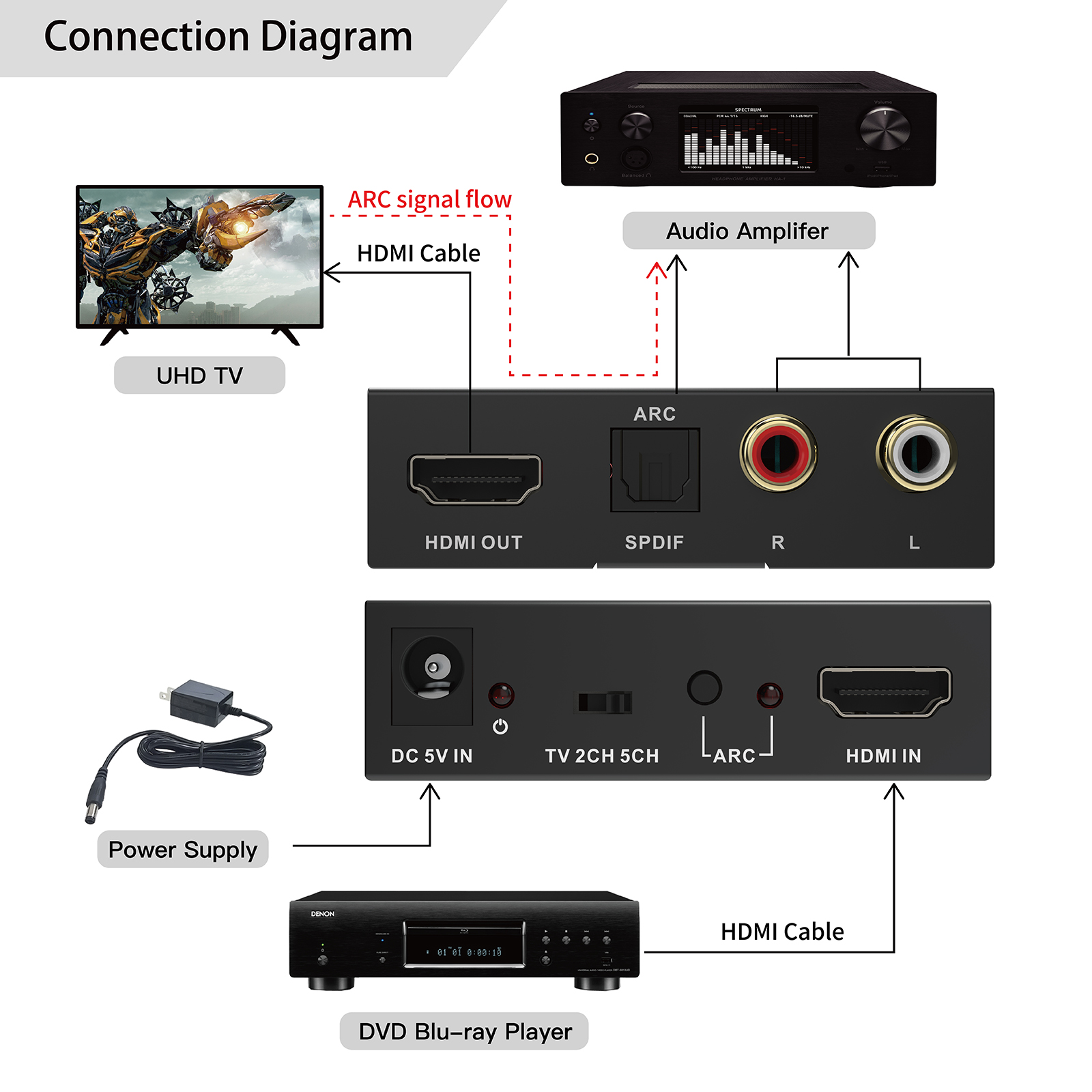 - HDMI x 1, R/L Audio(RCA )x 1, Toslink x 1