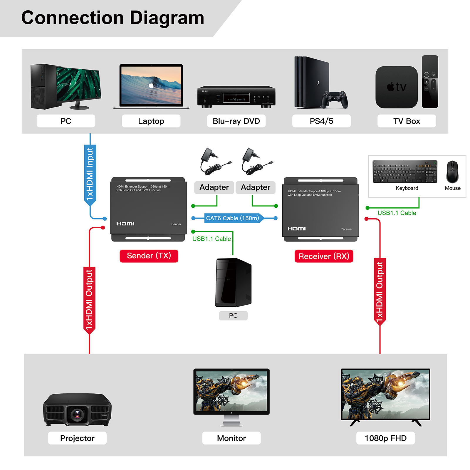 - Extending distance up to 150 meters (492feet) for both HDMI signal and USB signal