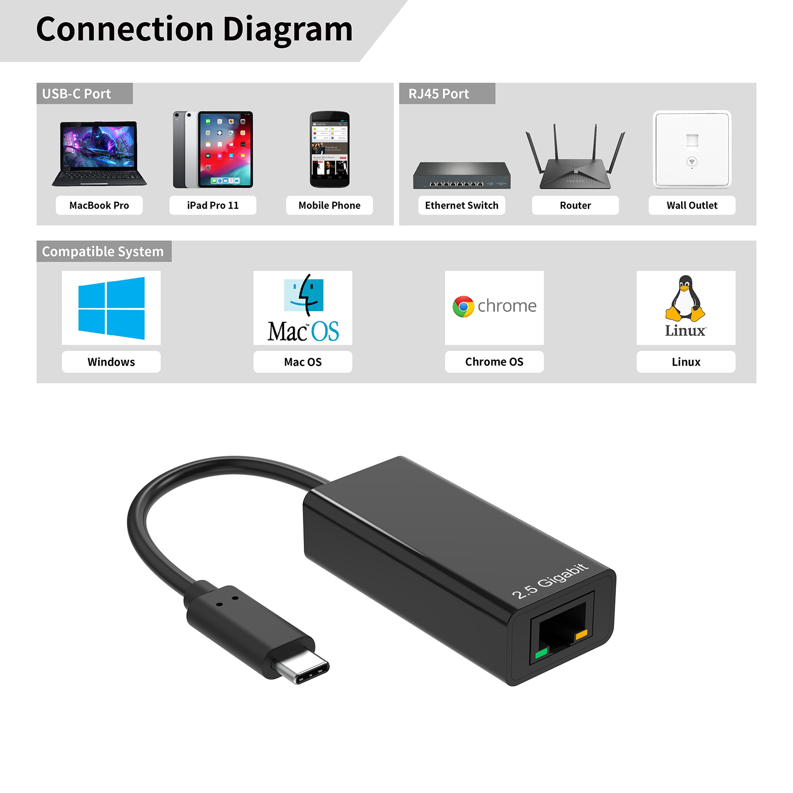 This USB-C to RJ45 Adapter plugs into your laptop’s USB-C port and connects to the wired network. Simply connect the adapter to the USB-C port on your USB-C-enabled device and then to your wired network via a UTP cable.